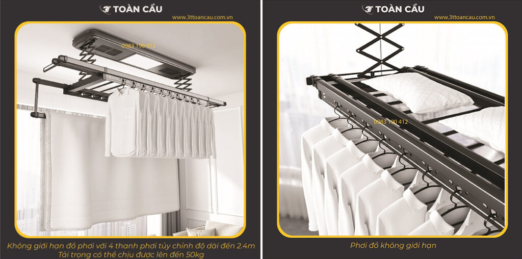 - Thanh phơi quần áo: 4 thanh chính có thể mở rộng lên đến 2.4m + 9 thanh phơi ngang để tăng khả năng phơi quần áo
