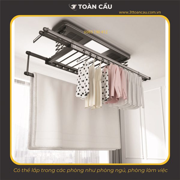 Các khu vực có thể ứng dụng giàn phơi thông minh điều khiển từ xa:Không chỉ lắp ở ban công như thông thường, với hình dáng bắt mắt, thiết kế thông minh Giàn phơi thông minh điện tử 3T còn có thể lắp trong phòng ngủ để tăng khả năng lưu trữ.
