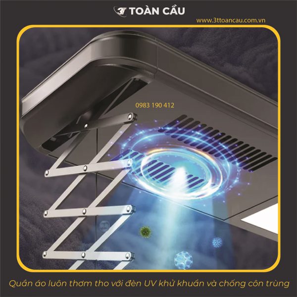 Giàn phơi thông minh điều khiển từ xa 3T-G8054-01 có chức năng khử khuẩn và chống côn trùng bám vào quần áo. Khả năng khử khuẩn tới 99%. Quần áo luôn thơm tho và không lo bị hoen ố do côn trùng bám vào.