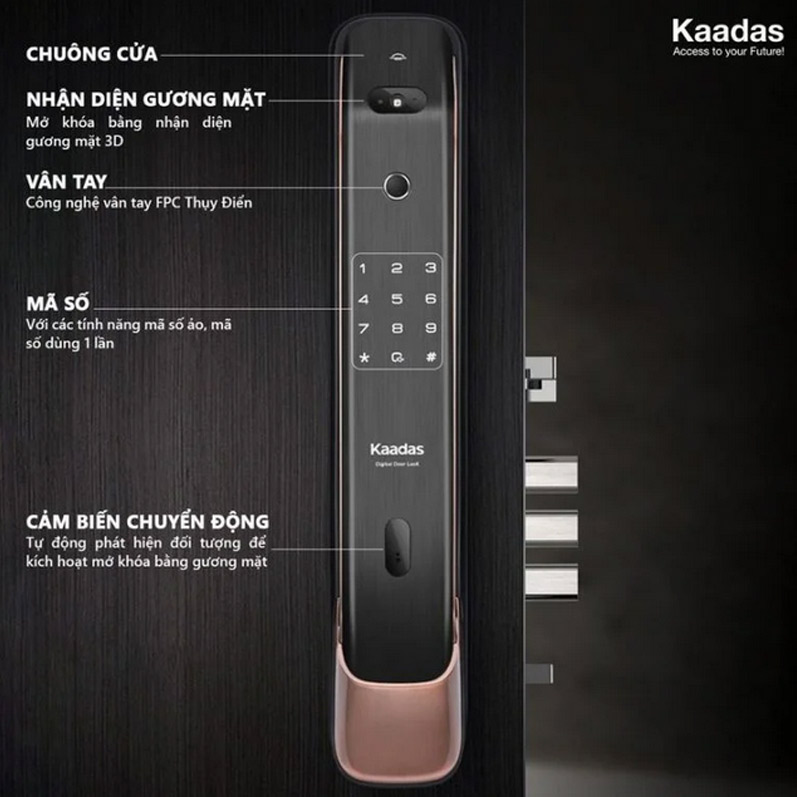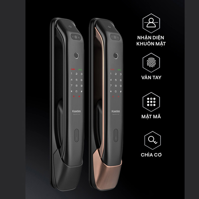 Khóa vân tay Kaadas K20F cho phép người dùng mở khóa bằng nhiều phương thức khác nhau như: vân tay, gương mặt, mã số và chìa cơ.