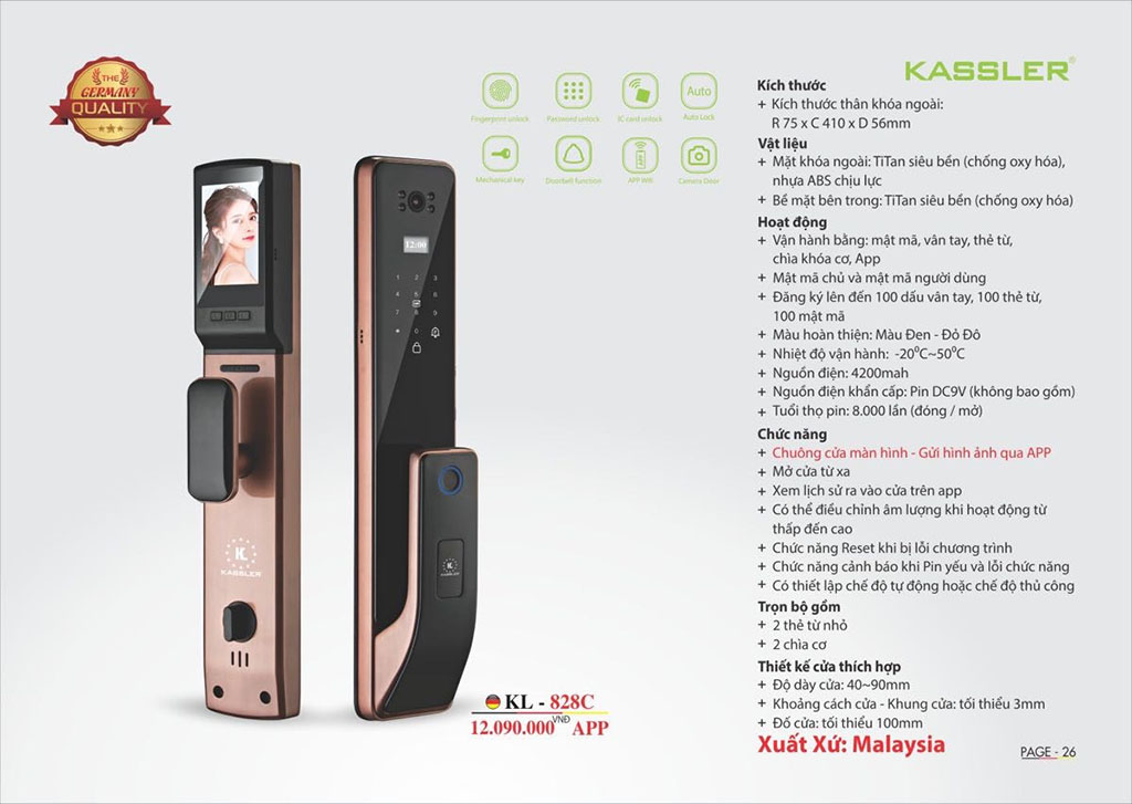- Kassler KL-828C Vận hành: Mật mã, vân tay, thẻ từ, chìa cơ, App điện thoại
